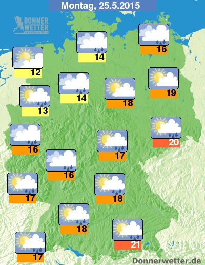 Am Montag zeigt sich der Himmel verbreitet wechselnd oder stark bewölkt, dabei fällt zeitweise Regen oder es bilden sich einzelne Schauer, im Süden und Osten auch mögliche Gewitter. Die Temperatur steigt auf kühle 12 Grad an der Nordsee und bis 21 Grad in München.
