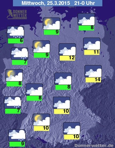 In der Nacht zum Donnerstag ist es zunächst bei starker Bewölkung noch verbreitet trocken und es fällt nur am Alpenrand sowie im Nordwesten gebietsweise Regen. Im weiteren Verlauf der Nacht werden die Wolken verbreitet dicht und sowohl im Süden als auch im Osten des Landes zieht zeitweiliger Regen auf. Nach Westen und Norden hin fällt nur vereinzelt etwas Regen oder Sprühregen. Die Temperatur sinkt auf 10 Grad in Berlin und bis 4 Grad in Saargau.