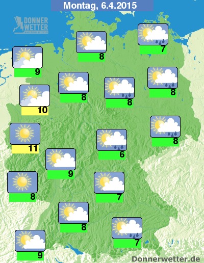 Zum Start in die neue Woche zeigt sich das Wetter im Nordosten, Osten und Südosten von seiner wechselhaften Seite, denn bei oft starker Bewölkung bilden sich wiederholt Schauer. Weiter nach Westen hin ist es hingegen oft aufgelockert, vor allem im Westen auch gering bewölkt oder gar sonnig, dazu bleibt es trocken. Die Temperatur erreicht 6 bis 11 Grad.