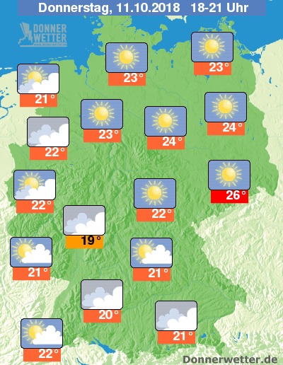 Am frühen Abend halten sich im Süden und Westen teilweise dichtere Wolkenfelder und Schleier, die auch weiter in die Landesmitte vorankommen können. Daraus fällt jedoch kein, oder kaum Regen. Sonst spendet die untergehende Oktobersonne noch goldene Strahlen und wohltuende Wärme. Die Temperaturen liegen vor Beginn der Dämmerung noch bei angenehmen 21 bis 26 Grad. Unter den dichteren Wolken bleibt es etwas kühler.