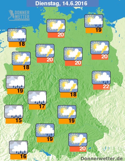 Am Dienstag sind zwar heitere Abschnitte möglich, zum Großteil ziehen aber dichte Wolken über uns hinweg und es bilden sich zeitweise Schauer, und insbesonders am Nachmittag zum Teil auch starke Gewitter. Die Temperatur steigt auf 15 Grad am Pfälzer Wald und bis 22 Grad an der Neiße.