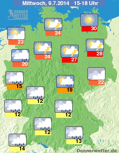 Heute Nachmittag ist es im Norden und Osten meist unbeständig und es können sich hier teils kräftige Schauer und Gewitter entladen, dazu ist es mit 22 bis 30 Grad vielfach schwülwarm. Im Westen und Süden hält sich dagegen meist eine geschlossene Wolkendecke und es fällt teils langanhaltender und ergiebiger Regen, dabei ist es mit 12 bis 20 Grad deutlich kühler als im Nordosten.