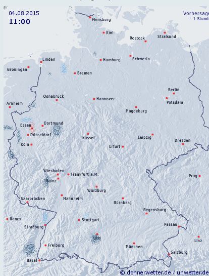 Die Abbildung unseres Regenscanners zeigt aktuell Schauer- und Gewittergebiete in Deutschland für ca. 11 Uhr. Es sind zur Zeit nur wenige eher schwache Schauer unterwegs. Die Situation ändert sich am Nachmittag. Heftige Schauer und Gewitter werden sich dann bilden: Link zum Regenscanner