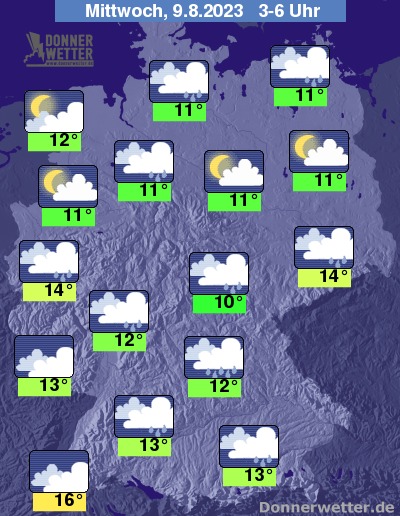 In der bevorstehenden Nacht zieht zeitweise kompakte und teils aufgelockerte Bewölkung durch, es bilden sich gebietsweise Schauer. Die Temperatur sinkt auf 16 Grad in Freiburg und bis etwa 10 Grad in Jena. An der See weht ein verbreitet stürmischer Wind, vor allem an der Nordsee mit vielerorts Sturmböen.