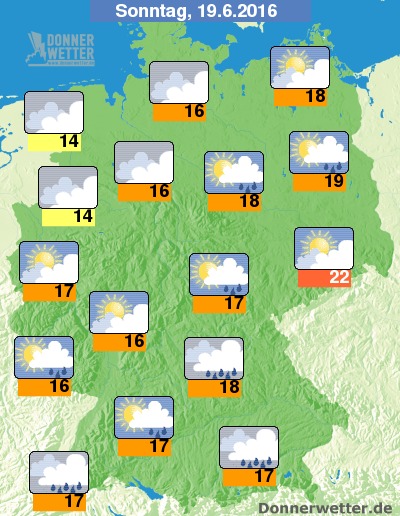 Am Sonntag bleibt es vor allem im Süden oft stark bewölkt bei zeitweiligen Schauern, selten auch Gewittern. Weiter nach Norden hin sind anfangs noch hier und da Schauer möglich, bei wechselnder und teils starker Bewölkung bleibt es jedoch überwiegend trocken. Die Temperatur steigt auf lediglich 14 Grad an der Ems und bis 22 Grad an der Neiße.