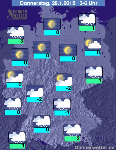 Am Donnerstag ziehen von Westen her kommend dichte Wolken mit teils kräftigen Schneefällen übers Land, vor allem in den westlichen Landesteilen fällt dabei auch häufig Regen oder Schneeregen. Im Osten und Nordosten ist es vormittags noch weitgehend trocken und teils freundlich, spätestens am Nachmittag ziehen aber auch hier dichte Wolken mit Schneefällen auf. Es besteht verbreitet Glättegefahr auf den Straßen. Die Höchstwerte erreichen 1 Grad im Grabfeld und bis 4 Grad am Oberrhein. Der Wind weht noch oft frisch, teils auch stark mit vereinzelt stürmischen Böen, an Nord- und Ostsee sind einzelne Sturmböen möglich.