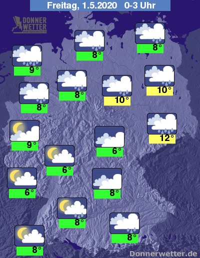 Der Maifeiertag startet vor allem an Rhein und Oder mit einer meist geschlossenen Wolkendecke, vor allem in der Westhälfte Deutschlands fällt daraus auch immer wieder Regen. In den übrigen Landesteilen zeigt sich der Himmel mal heiter, mal ist es locker bewölkt und es bleibt meist trocken.