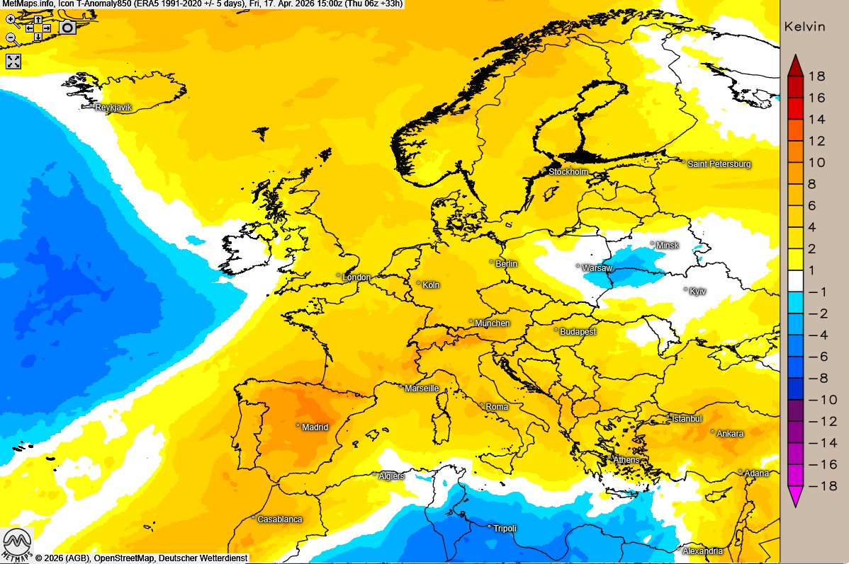 Die Temperatur- und Wetterkarte für 06:00 / 12:00 Uhr sowie die Temperaturabweichung Europa um 15:00 Uhr nach ICON: