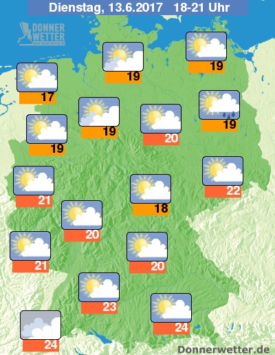 Heute Abend sind in und rund um Berlin noch vereinzelt Schauer unterwegs, im übrigen Bundesgebiet herrscht hingegen verbreitet heiteres oder sonniges und dabei trockenes Wetter. Die Abendwerte liegen bei 17 Grad in Emden und bis 24 Grad m Raum München.