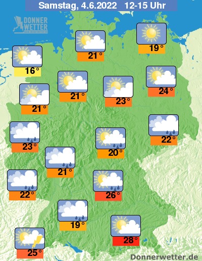 In den Nachmittagsstunden bleibt der Himmel über dem Norden heiter oder nur gering bewölkt und es bleibt trocken. In der Südhälfte nimmt die Quellbewölkung im Nachmittagsverlauf immer weiter zu. Schauer und teils kräftige Gewitter mit Unwetterpotential, regional mit Starkregen, Hagel und Sturmböen einhergehend, sind vor allem südlich der Donau möglich.