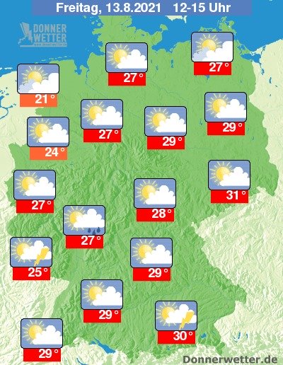 Heute Abend ist es zumeist locker oder aufgelockert, hier und da auch stark bewölkt, dabei bilden sich nur noch selten, am ehesten noch im Süden Deutschlands vereinzelt Schauer oder Gewitter. Die Temperatur liegt bei 21 Grad in Emden und bis 32 Grad in München.