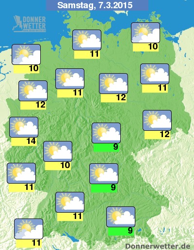 Abgesehen von Teilen der südlichen Mittelgebirge, steigen die Höchstwerte heute deutschlandweit über die 10-Grad-Marke, im Westen sind sogar 14 Grad C möglich.