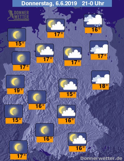 Die Temperaturen liegen am frühen Abend im Nordosten, dort wo es noch längere Zeit trocken blieb zwischen 22 und 27 Grad. Sonst werden nur noch 16 bis 21 Grad erreicht.