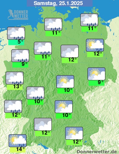 Am Samstag zeigt sich der Himmel über dem im äußersten Süden und Südosten wechselnd bis aufgelockert bewölkt und es bleibt weitgehend trocken. Sonst überwiegt am Samstag starke Bewölkung, dabei fällt vom Westen bis in den Nordosten zeitweise Regen.