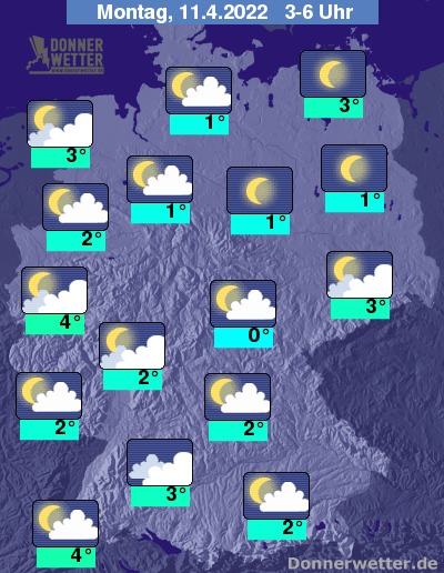 In der Nacht zum Montag klart der Himmel vom Nordosten bis in den Osten verbreitet auf. Im übrigen Bundesgebiet ist es locker bis aufgelockert, teils auch stärker bewölkt, dazu bleibt es trocken. Die Temperatur sinkt auf 4 Grad in der Kölner Bucht und bis 0 Grad in Jena.