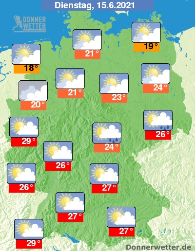 Am Dienstag ist es häufig heiter bis sonnig, gebietsweise ziehen allerdings auch mehr und zum Teil dichte Wolken durch, dabei bilden sich im Osten vereinzelte Schauer, selten auch Gewitter. Im übrigen Land bleibt es weitgehend trocken bei Höchstwerten von 18 Grad an der Nordsee und bis 29 Grad im Rheinland.