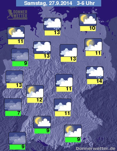 In der Nacht zum Samstag fällt unter meist dichten Wolken im Osten, Südosten und in der Mitte des Landes zeitweise Sprühregen, sonst ist es vielfach aufgelockert bewölkt, nach Südwesten und im äußersten Norden auch sternenklar und es bleibt trocken. Jedoch bildet sich stellenweise Nebel oder Dunst. Die Temperatur sinkt auf 14 Grad in der Lausitz und etwa 7 Grad im Saargau.