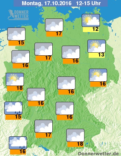 Heute Abend lockert die Bewölkung im Nordwesten verbreitet auf. Dichte Regenwolken liegen jedoch vor allem im Südwesten, jedoch auch im Süden und weiten Teilen Westdeutschlands. In den übrigen Landesteilen ist es zwar stark bewölkt, aber trocken. Die Temperatur liegt anfangs bei 12 bis 18 Grad.