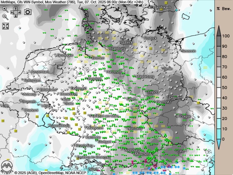 Am Dienstag zeigt sich der Himmel meist stark bewölkt oder es ist bedeckt. Dabei fällt von Norden bis in den Osten zeitweise Regen. Sonst bleibt der Dienstag weitgehend trocken mit Lichtblicken vor allem in den südwestlichen Landesteilen.