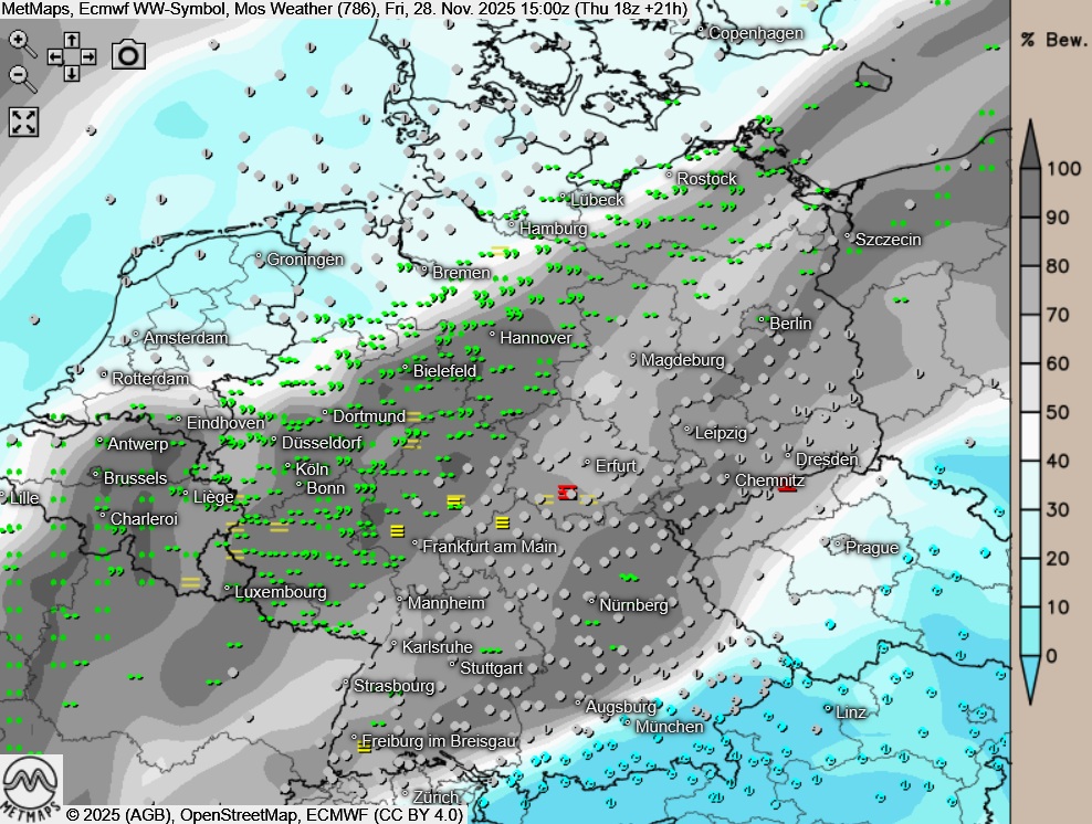 Am Freitagnachmittag zeigt sich der Himmel überwiegend stark bewölkt, dabei fällt im Westen und Nordwesten sowie in der Landesmitte zeit- und gebietsweise etwas Regen oder Sprühregen. Im Südosten gibt es neben zährem Hochnebel auch zeitweise Auflockerungen, es bleibt trocken. Die meiste Sonne gibt es am Nachmittag am Alpenrand.