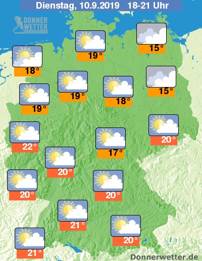 Am Abend lässt der Regen an der Ostsee immer mehr nach, die Wolkendecke bleibt jedoch häufig geschlossen. Im übrigen Land kann man die untergehende Sonne im Wechsel mit lockeren Wolkenfeldern noch genießen.