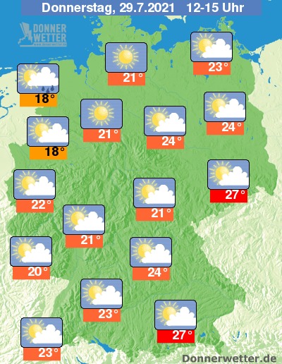 Heute Abend sind im Umfeld der Nordsee und auch der Alpen gebietsweise dichte Quellwolken möglich, die hier zu Schauern und auch zu Gewittern führen können. Im übrigen Bundesgebiet ist es aber zumeist heiter bis sonnig, teils auch aufgelockert bewölkt und dazu trocken. Die Temperatur liegt bei 19 Grad in Cuxhaven und bis 27 Grad in München.