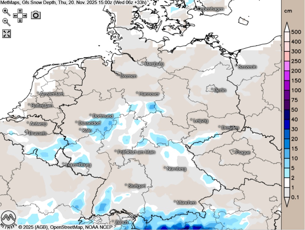 Die Temperatur- und Wetterkarte sowie die Schneehöhen am Mittwochnachmittag (15:00 Uhr) nach GFS: