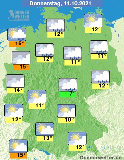 Am Donnerstag zeigt sich das Wetter im Süden meist heiter bis wechselnd bewölkt. Weiter nach Norden hin ist es dagegen überwiegend stark bewölkt oder bedeckt, Auflockerungen sind lokal möglich. Es bilden sich jedoch auch nur vereinzelt Schauer, oft bleibt es auch trocken. Die Temperatur steigt auf 7 Grad im Grabfeld und bis 16 Grad im nördlichen Emsland.