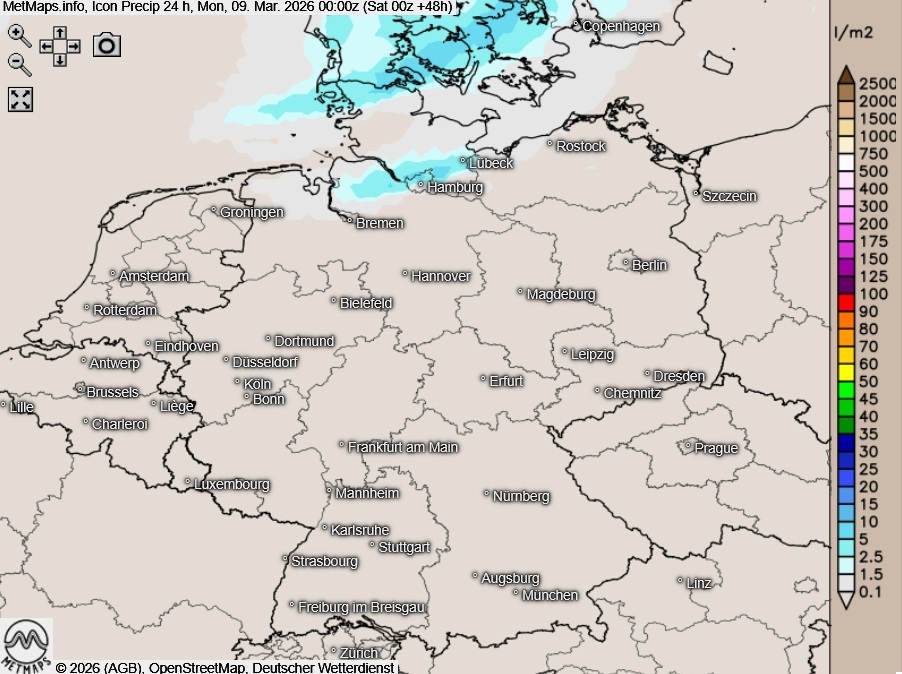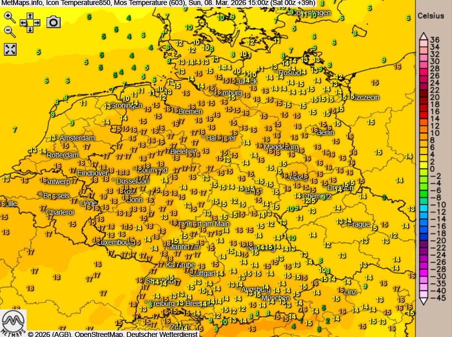 Die Temperatur- und Wetterkarte für Sonntagnachmittag (15:00 Uhr) sowie die 24-Stunden-Regenmegen für Sonntag nach ICON: