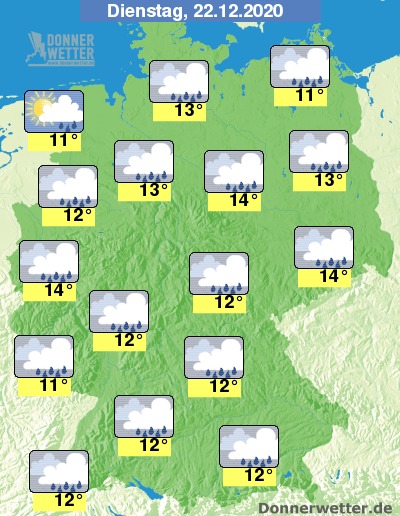 Meist stark bewölkt und häufig Regen, in der Nacht auf den ersten Weihnachtsfeiertag zurückgehende Temperaturen und gebietsweise Schneefall oder Schneeregen.