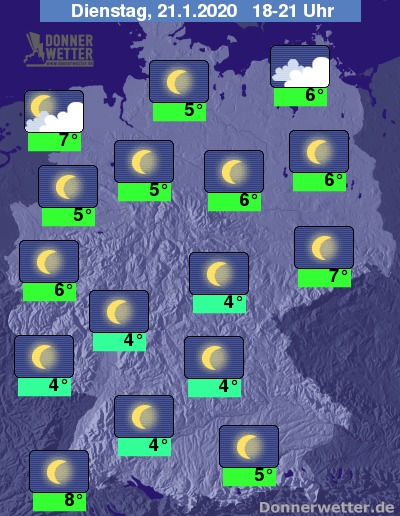 Bis Mitternacht dringen die Wolken etwas weiter bis in die Norddeutsche Tiefebene vor, in der Südhälfte bleibt es mit Ausnahme sich bildender Nebelfelder nahezu wolkenlos.