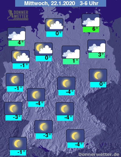 Mit 1 bis 6 Grad bleibt es an den Küsten und im Nordosten am mildesten. Sonst herrscht mit -5 bis -1 Grad verbreitet Frost und die Gefahr von Reifglätte.