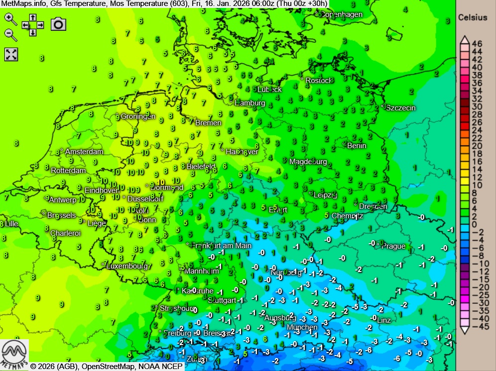 Die Lufttemperatur- und Böenkarte für Freitagfrüh (06:00 Uhr) sowie die 24-Stunden-Regenmengen nach GFS: