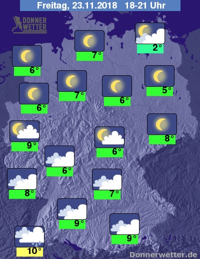 Vor Dämmerungsbeginn bewegen sich die Temperaturen zwischen mäßig-kalten 2 Grad in Teilen Mecklenburg - Vorpommerns und milden 10 Grad im Breisgau.