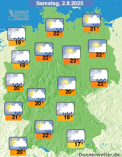 Am Samstag zieht zumeist starke Bewölkung durch, hier und da ist es aber auch locker oder aufgelockert bewölkt. Es bilden sich gebietsweise Schauer, zudem sind auch örtliche Gewitter möglich. Die Höchstwerte erreichen 17 Grad in München und bis 23 Grad in Magdeburg.