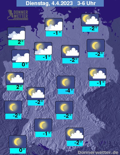 In der Nacht zum Dienstag ist es überwiegend locker bewölkt oder sternenklar. Im Norden ziehen zunehmend dichte Wolken durch, die jedoch keinen Regen bringen. Im übrigen Land bleibt es ebenfalls trocken bei Tiefstwerten von 2 Grad an der Nordsee und bis -4 Grad im Grabfeld.