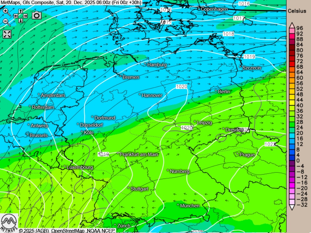 Die akkumulierten Niederschlagsmengen in Europa bis 26.12. nach ICON und die Strömungs- sowie Wetter- und Temperaturkarte für Samstagfrüh nach GFS:
