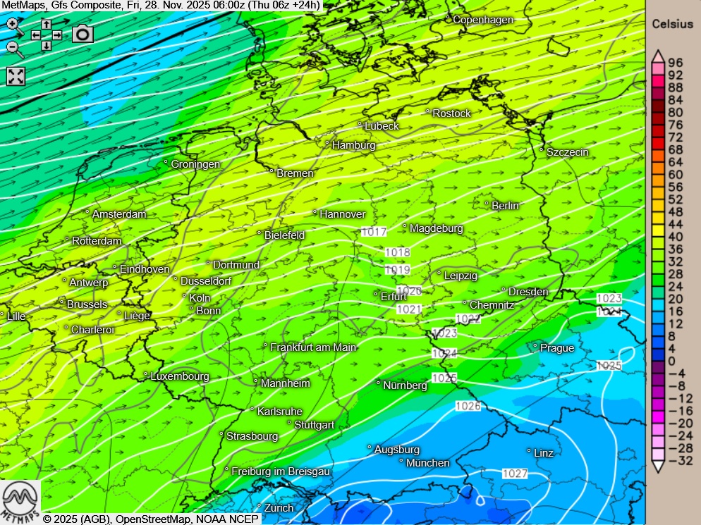 Die Strömungs- und Wetterkarte für Freitagfrüh nach GFS: