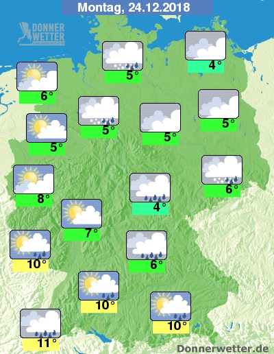 Am heutigen Heiligabend bleiben weiterhin die Wolken vorherrschend, dabei fällt besonders am Alpenrand noch teils langanhaltender Regen, in höheren Lagen Schnee. Über der übrigen Osthälfte fällt hier und da etwas Regen, Schneeregen oder Schnee, weiter nach Westen hin kann es vor allem am Nachmittag gebietsweise auflockern, dazu bleibt es hier weitgehend trocken. Die Temperatur steigt auf 4 bis 11 Grad.