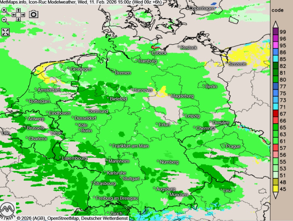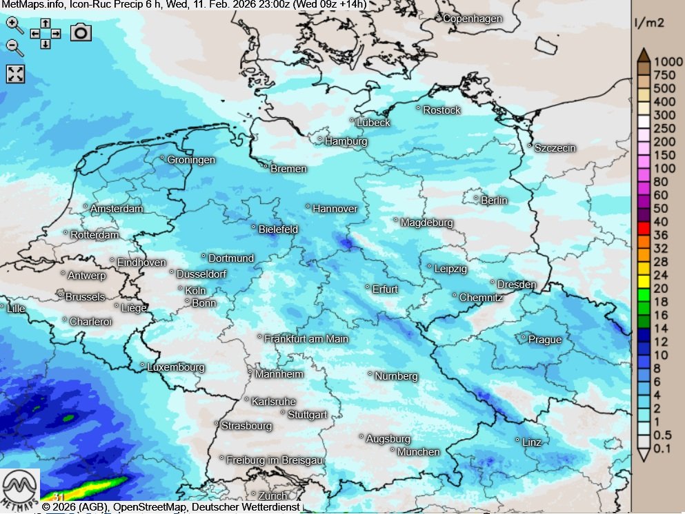 Am Mittwochnachmittag bleibt der Himmel über weiten Landesteilen stark bewölkt oder es ist bedeckt. Dabei fällt vor allem im Südwesten sowie in den Staulagen der Mittelgebirge teils ergiebiger Regen. Es weht ein starker bis stürmischer Wind, auf den Gipfeln auch Sturmböen oder schwere Sturmböen.