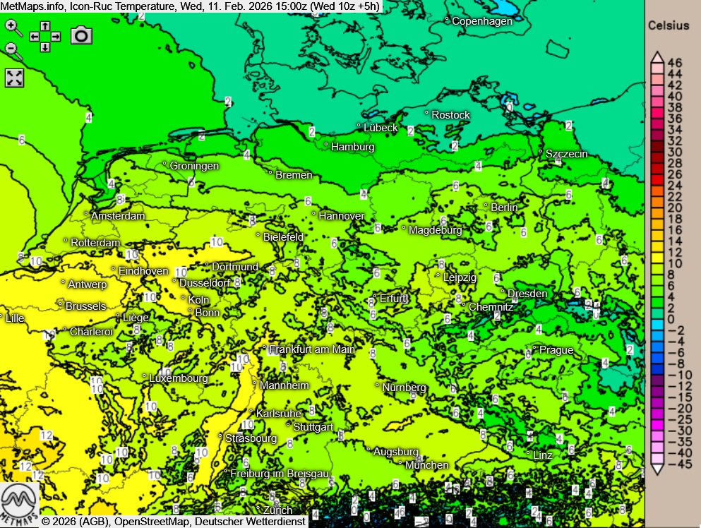 Die Temperaturen erreichen am Nachmittag Höchstwerte um 1 Grad im Nordosten und bis 11 Grad am Oberrhein.