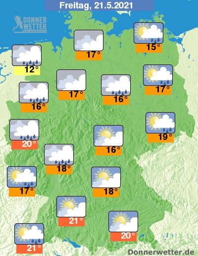 Am Freitag ist es im Osten anfangs noch zum Teil aufgelockert bewölkt und dazu trocken. Im übrigen Land ist es bereits stark bewölkt, dazu fällt im Norden und Nordwesten bereits gebietsweise Regen. Im Tagesverlauf fällt mit Ausnahme des Südens auch im übrigen Land gebietsweise Regen. Die Temperatur steigt auf 12 Grad in Cuxhaven und bis 21 Grad in Freiburg.