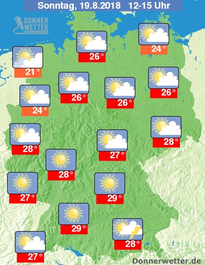 Heute Nachmittag scheint zum Großteil die Sonne von einem oft auch wolkenlosen Himmel. Im Norden ziehen jedoch auch hier und da mal mehr Wolken durch, dabei bleibt es trocken. Im Alpenvorland können sich allerdings gebietsweise Schauer und Gewitter bilden. Die Temperatur erreicht 21 Grad an der Nordsee und bis 29 Grad in Schwaben.