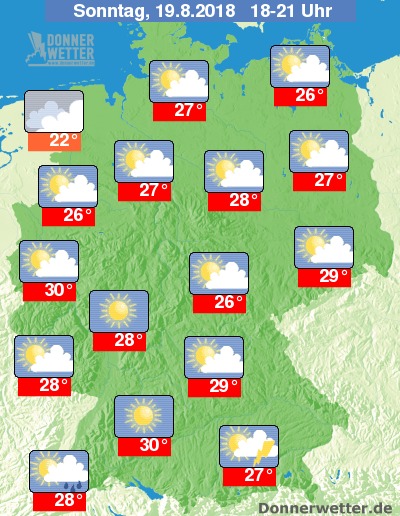 Heute Abend ist es weiterhin verbreitet heiter oder sonnig, im Norden ziehen gebietsweise mehr Wolken durch und an der Nordsee ist es oft wolkenverhangen, dabei bleibt es trocken. Lediglich über dem Alpenvorland bringen dichte Wolken einzelne Schauer und Gewitter. Die Temperatur liegt bei 22 Grad in Emden und bis 30 Grad in Stuttgart.
