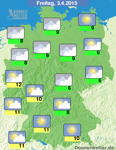 Am Freitag halten sich von der breiten Mitte bis in den Norden des Landes oft dichte Wolken, gebietsweise und vor allem nach Nordosten hin kann sich die Wolkendecke aber lösen und der Sonne Platz machen. Weiter nach Süden hin ist es verbreitet heiter oder sogar sonnig. Gebietsweise ziehen aber auch hier mal mehr Wolken durch. Es bleibt landesweit trocken. Die Höchstwerte erreichen 6 Grad im Vogtland und etwa 12 Grad in der Kölner Bucht.