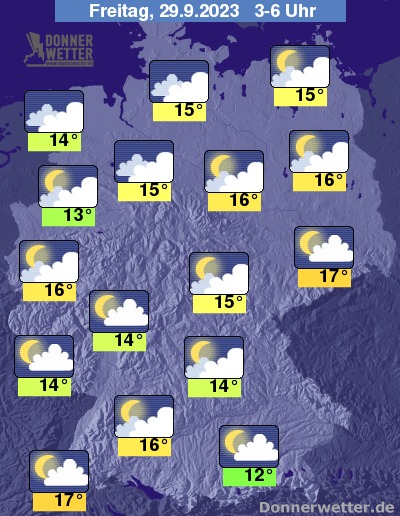 In der folgenden Nacht ist es über dem Süden oft locker bis wechselnd, sonst weitgehend aufgelockert bis stark bewölkt. Es bleibt trocken bei Tiefstwerten von 17 Grad in Dresden und 12 Grad in Augsburg.