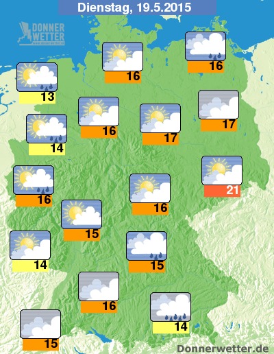 Am Dienstag bleibt es im Südosten und Süden weitgehend bedeckt und es fällt zum Teil langanhaltender und ergiebiger Regen. Im Norden und Westen ist es aufgelockert bis stark bewölkt und es können sich Schauer, vor allem im Norden auch einzelne Gewitter entwickeln. In einem breiten Streifen vom Saarland bis nach Ostdeutschland bleibt es hingegen weitgehend trocken und die Sonne kann sich neben einigen Wolken häufiger zeigen. Die Temperatur steigt auf 13 Grad an der Nordsee und bis 21 Grad in Görlitz.