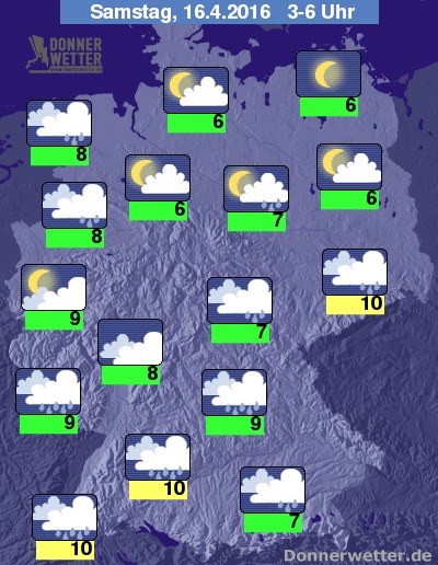 In der folgenden Nacht bleibt es im Süden bei dichter Bewölkung und zeitweisem Regen, aber auch über der breiten Mitte und dem Nordwesten des Landes ist es oft stark bewölkt und es können sich einzelne Schauer bilden. Im Norden und Nordosten ist es meist nur locker oder aufgelockert bewölkt, zum Teil auch sternenklar und es bleibt überwiegend trocken. Die Temperatur sinkt auf 10 Grad in Freiburg und bis 6 Grad in Neubrandenburg.