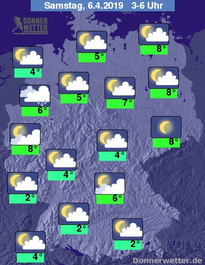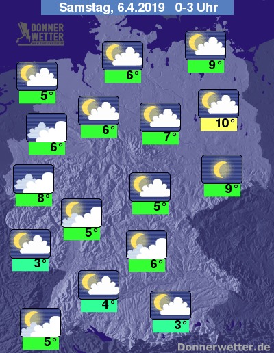 Die Temperaturen liegen in den Frühstunden bei Werten um 1 Grad C im Pfälzer Wald und bereits sehr milden 11 Grad C in der Lausitz.