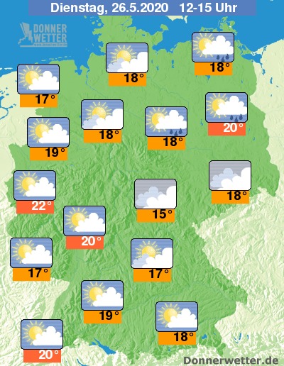 Die Temperaturen bewegen sich zwischen 15 Grad in Thüringen und 22 Grad in der Kölner Bucht.